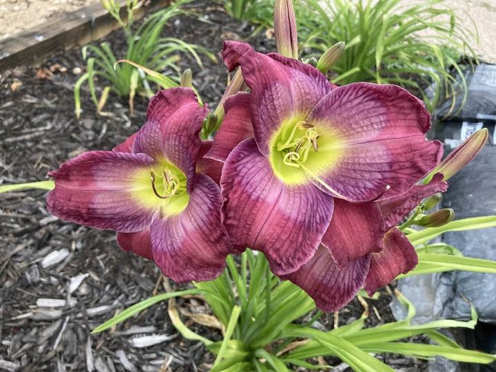 Color: wine red with magenta veins and blue lavender eye above chartreuse throat